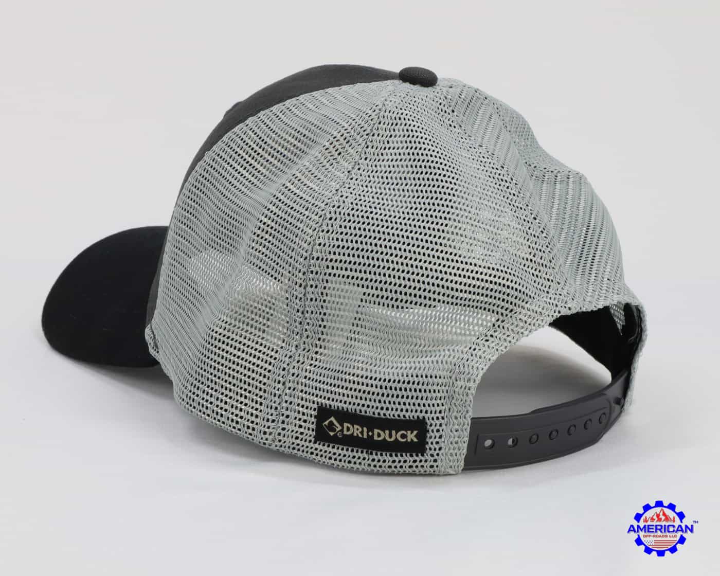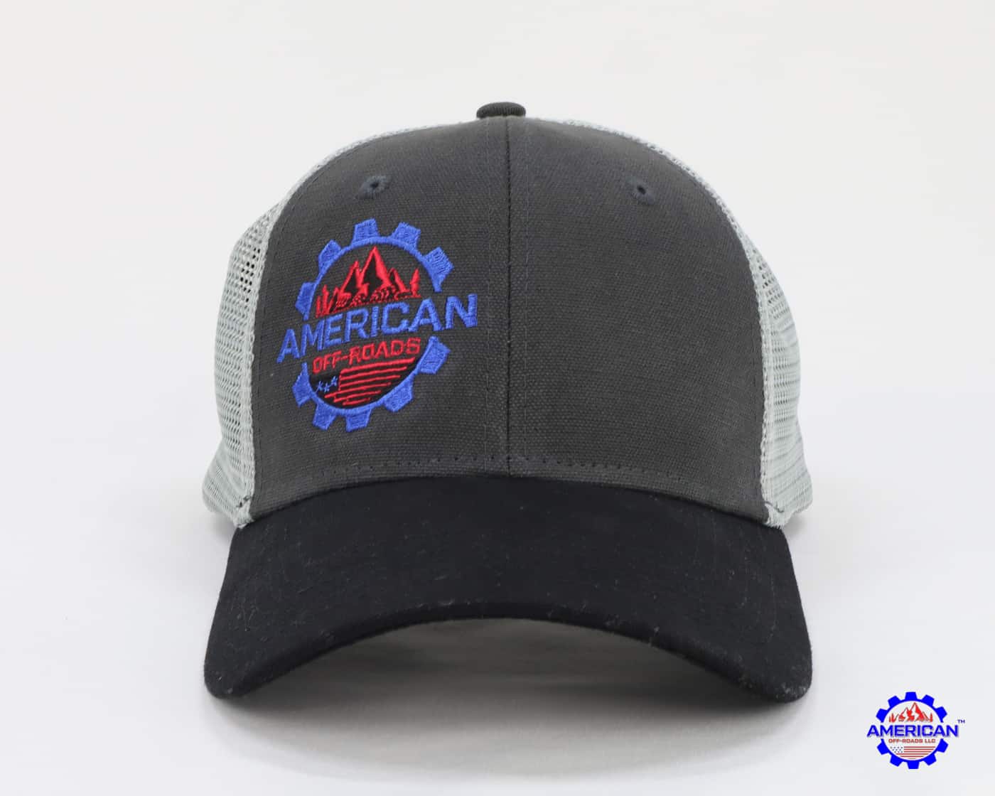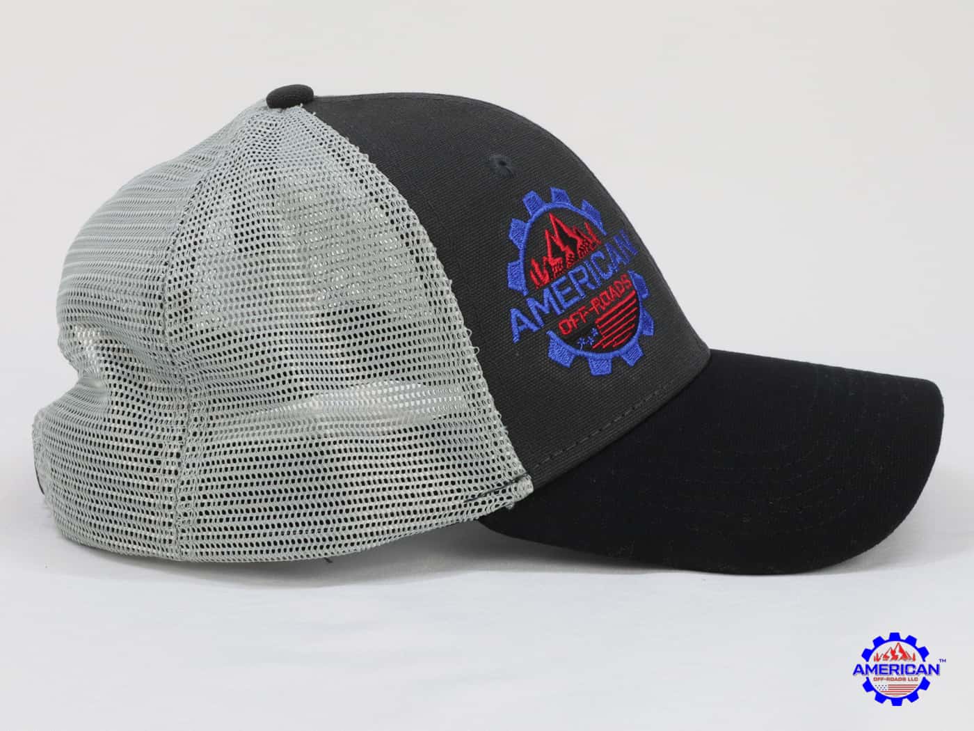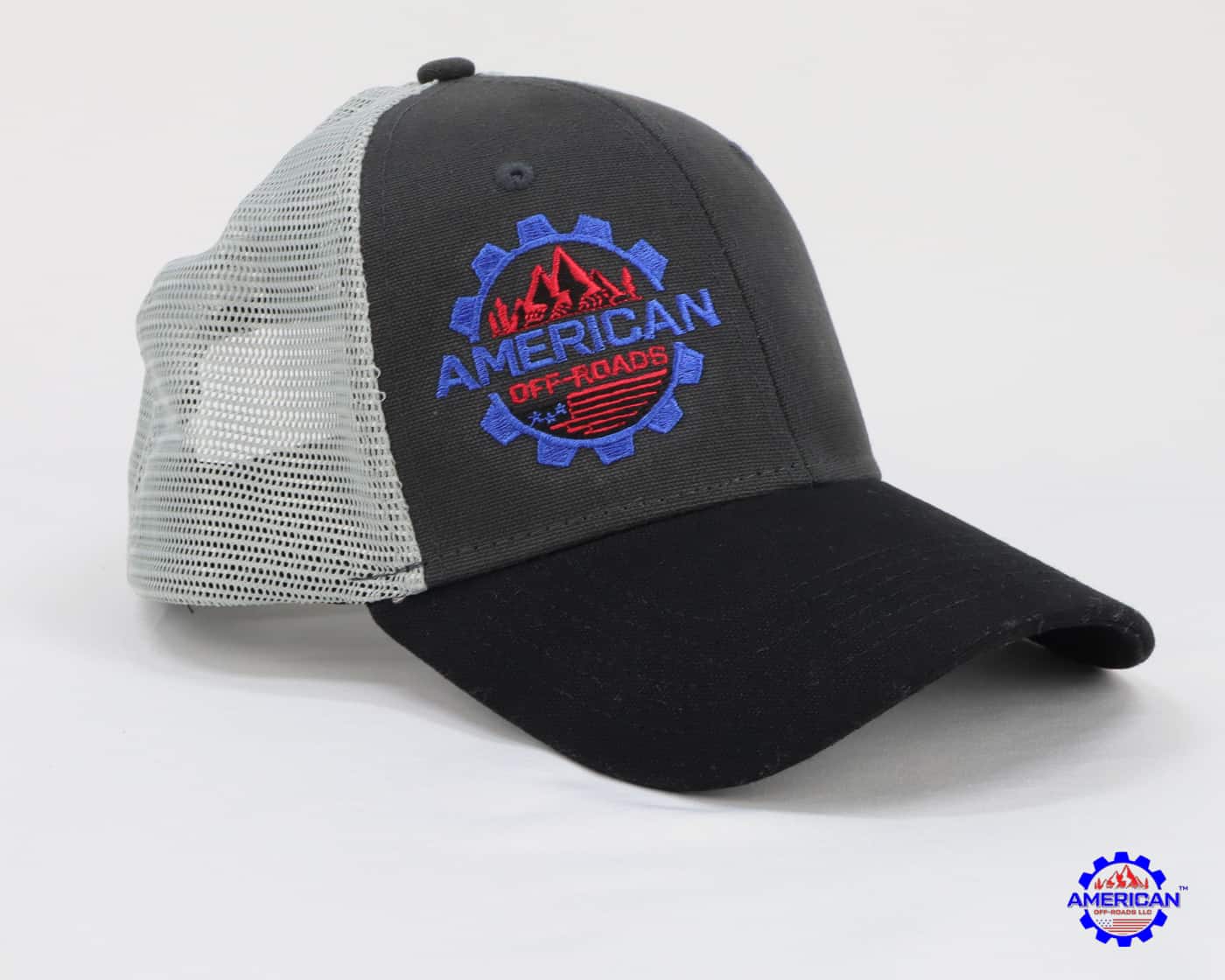 This Custom American Off Road Trucker Hat Features Black Front Panels And Grey Mesh With The American Off-Roads Logo On Front Right.