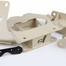 We’ve created a plate system that ties the front mounting points along with the upper rear mount together in full via 3 different welded assemblies. The front of the X3 is what we call a floating front end. The front of the chassis ahead of the front a arms attaches via the front arms and is only supported by the radiator. If you were to pull on that that portion of the frame you’re pulling on the front suspension bolts only, its a risky move. Our front welded assembly keeps that front section from twisting and also from pulling solely on the a arm bolts. This is the same void in the frame where the front of the a arms pivot. The front of the frame no longer floats at this point and is tied into firmly with the rest of the chassis. Above the diff we have 2 different pieces of metal that tie the rear upper pivot point to both front a arm points. This not only strengthens the frame from the bolts trying to pull out but it greatly reduces the chance of the frame twisting. During pulling forces this can also uses transfers energy to the rear upper a arm mounting plate to help spread the load and increase strength. The single plate over the diff that ties the upper mounting points together will keep the rear upper arm pivot of the chassis from twisting under hard impacts. The final plate piece is additional reinforcement to to the rear lower mounting points of the suspension and finishes the gusset kit.