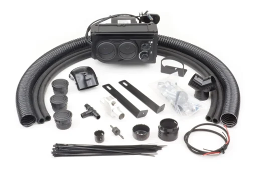 This Ice Crusher Under Dash Compact Heater kit has Two 360 adjustable front louvers that directs the heat were you need it and an optional 2” vent defrost kit option to keep your windshield clear. This heater features a three speed fan and a temperature adjustment is located right on the 14,600 BTU* heater unit. The heater mounts under the center of the dash which leaves plenty of room for your feet. Kits are supplied with our custom CNC made alloy Y connectors which connect directly to the engines cooling system.