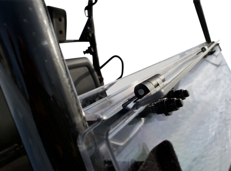 The top of the folding part of the windshield is connected to the roll cage with two hook-and-loop straps