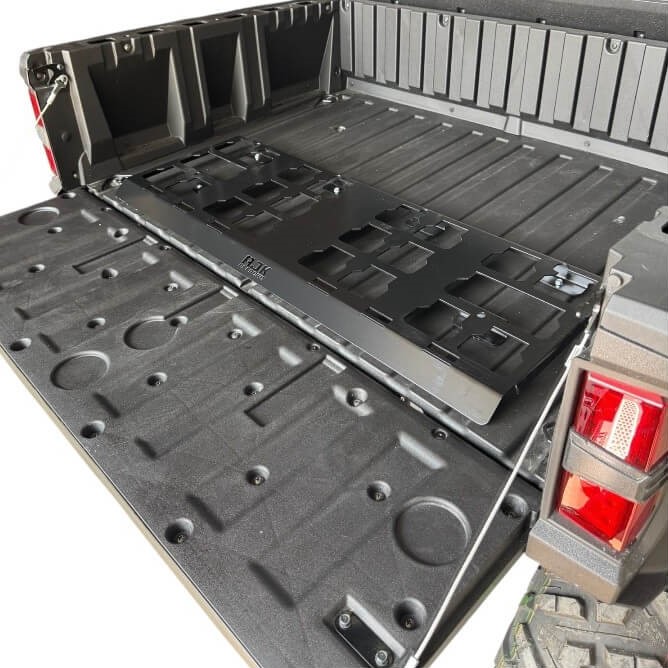 This Ridge Pack out mount is designed to work in the front or rear of the bed. Each mount is cut with both hole pattern for an easy install in either location and work with two large Milwaukee boxes with the aluminum rails. Yes you can fit 2 large coolers on this mount.