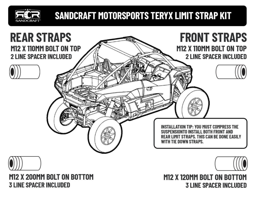 Sandcraft Kawasaki Teryx H2 Limit Straps & Made in American Double Stitching Quality. The Kit Comes with Mounting Hardware & Straps so you Don’t Bottom Out Shocks
