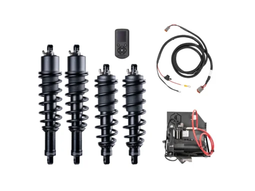 - Kit includes four shock assemblies, pre-mounted compressor assembly, remote control, wire harness, airline, and air fittings for easy installation
