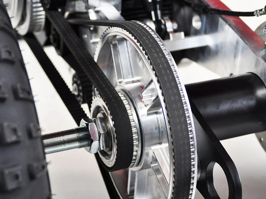 Smooth electronic throttle control feeds instantaneous power to the 750 watt motor delivering speed and torque to the rear wheels through a dual belt drive system. The secondary belt system is fed by the billet aluminum pedals which turn the rear axle just like a traditional bike.