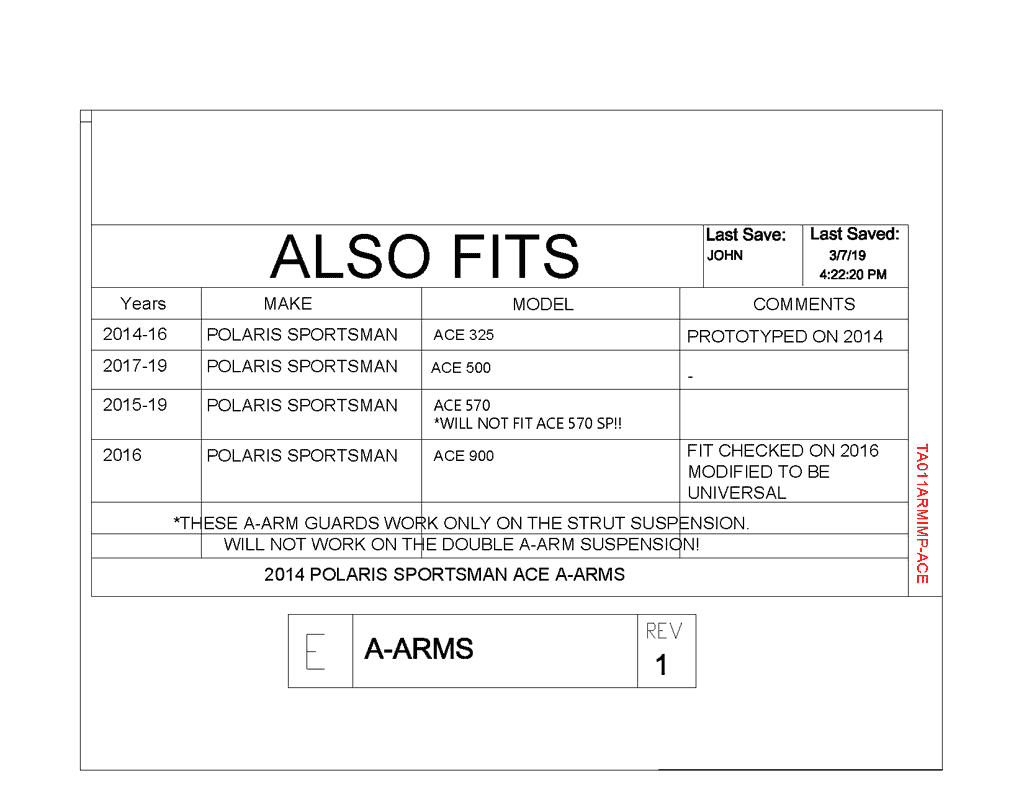Fits Polaris Sportsman ACE 325, 500, 570, 900 that has a strut suspension. Will not fit the ACE 900 XC, the ACE 570 SP or the double a-arm suspension on any ACE models.