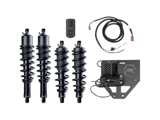 - Kit includes four shock assemblies, pre-mounted compressor assembly, remote control, wire harness, airline, and air fittings for easy installation