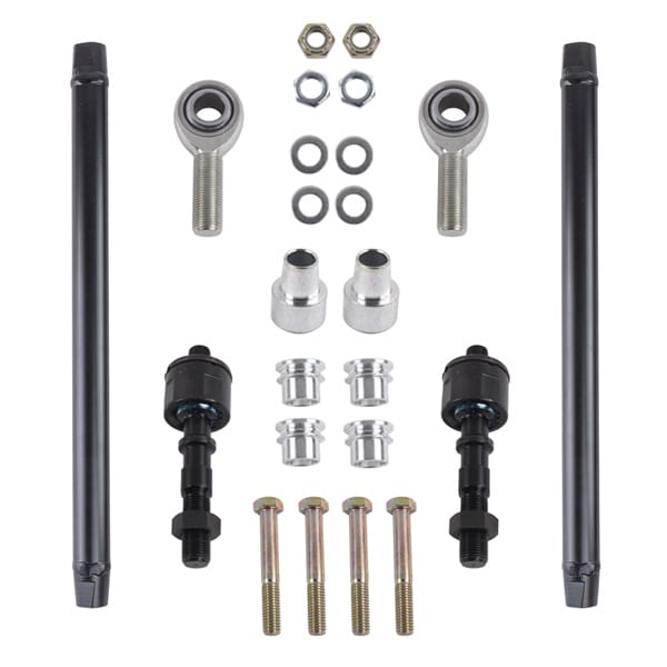 Axle components are made from 4340 Chromoly steel for exceptional durability and dual heat treated for improved toughness. Oversized CV joints and shafts further strengthen the double-plunging axles. UV-protected brake lines are made in the USA from PTFE Teflon-lined stainless steel braided hose. They have a clear, protective PVC cover and feature triple chrome plated end fittings for superior corrosion resistance. All heavy-duty tie rods come equipped with 3-piece precision heim joints made from heat-treated 4130 chromoly steel. Powder-coated and oversized for strength, they stand up to extreme conditions. Built tough, this long travel kit delivers superior strength, wear resistance and longevity.