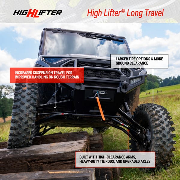 Hit the trails with confidence with the High Lifter Long Travel Suspension Kit. Designed for fast riding in dunes, traction over rocks and on complicated trails, this long travel kit delivers more suspension travel and front tire clearance. Longer wheel travel and added ground clearance improve traction, balance and stability for softer landings and better ride quality, no matter how long or hard your ride.