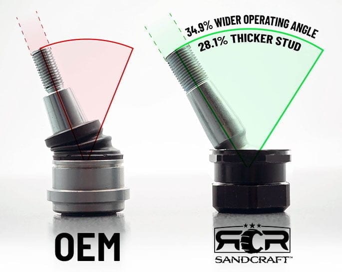 The SANDCRAFT kit has 34.9% more operating angle and features a stud that is 28% thicker at the threads than OE.