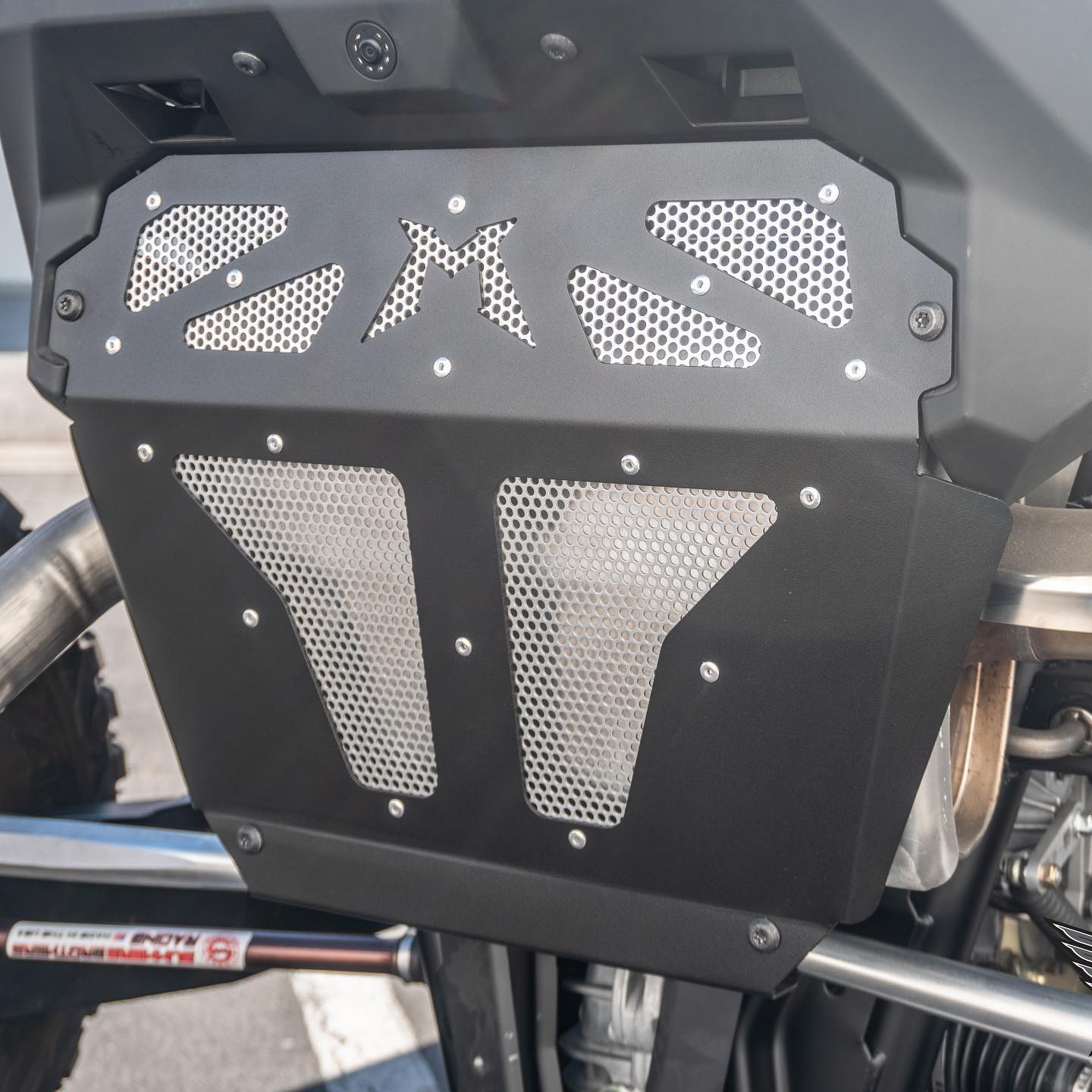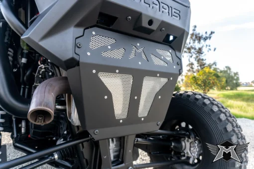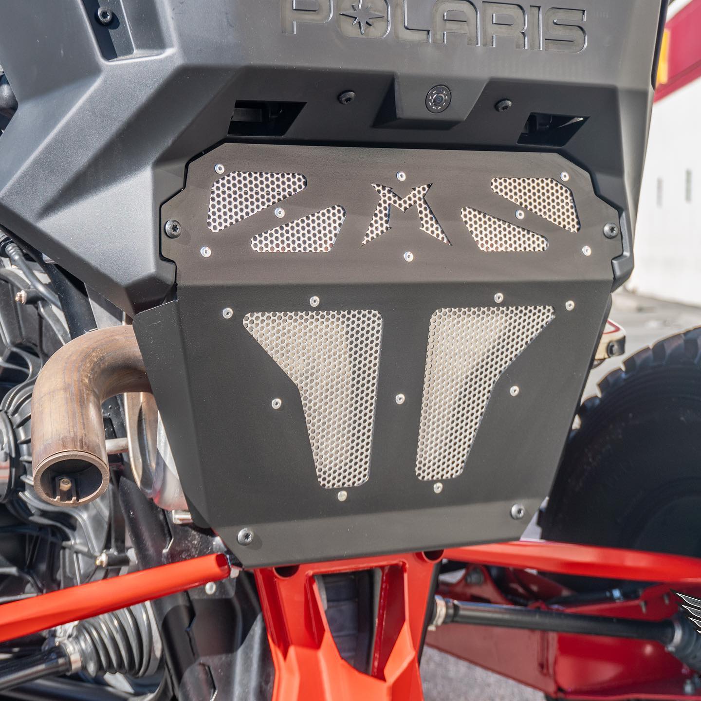Our Laser Cut Aluminum RZR Turbo R Exhaust Cover Features Perforated Mesh, Easy Mounting Uses Same Mounting As Plastic Cover. Muffler Style and Protection