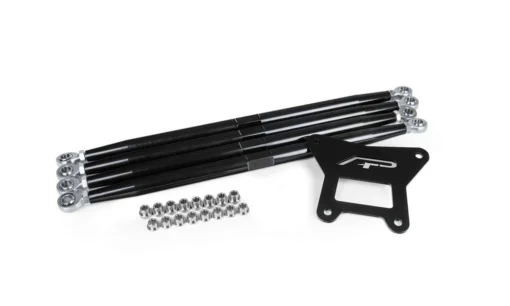 The radius arm kit includes a new 3/16 inch thick rear frame brace that has been precision water jetted out of 1018 steel which will not flex or bend under the hardest conditions.