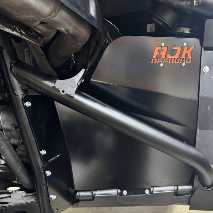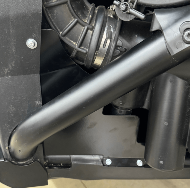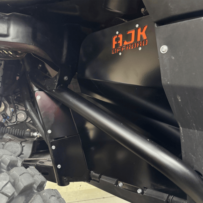 This is a fairly simple install and all hardware is included. You will need to use our self drilling screws and drill them in the round tubing of your frame to hold our mud guards in place. You will also need to drill a 1/4″ hole in your inner plastic fender to help hold the mud guard in place.