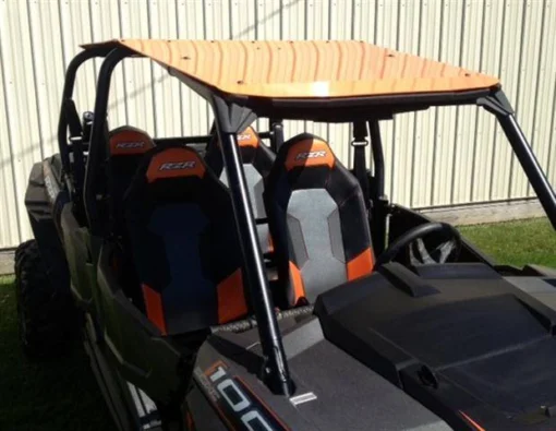 Protect Driver And Passengers From The Rain And Sun With 4 Seat RZR 4 Metal Roof. Rubber Coated Mounting Straps And Front/Rear Gutters Divert The Rain.