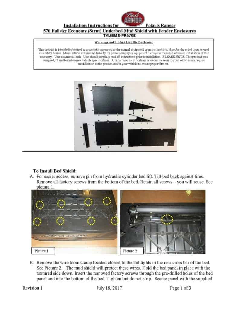Trail Armor Mud Shields Under the Bed For Ranger 570 Full Size Models
