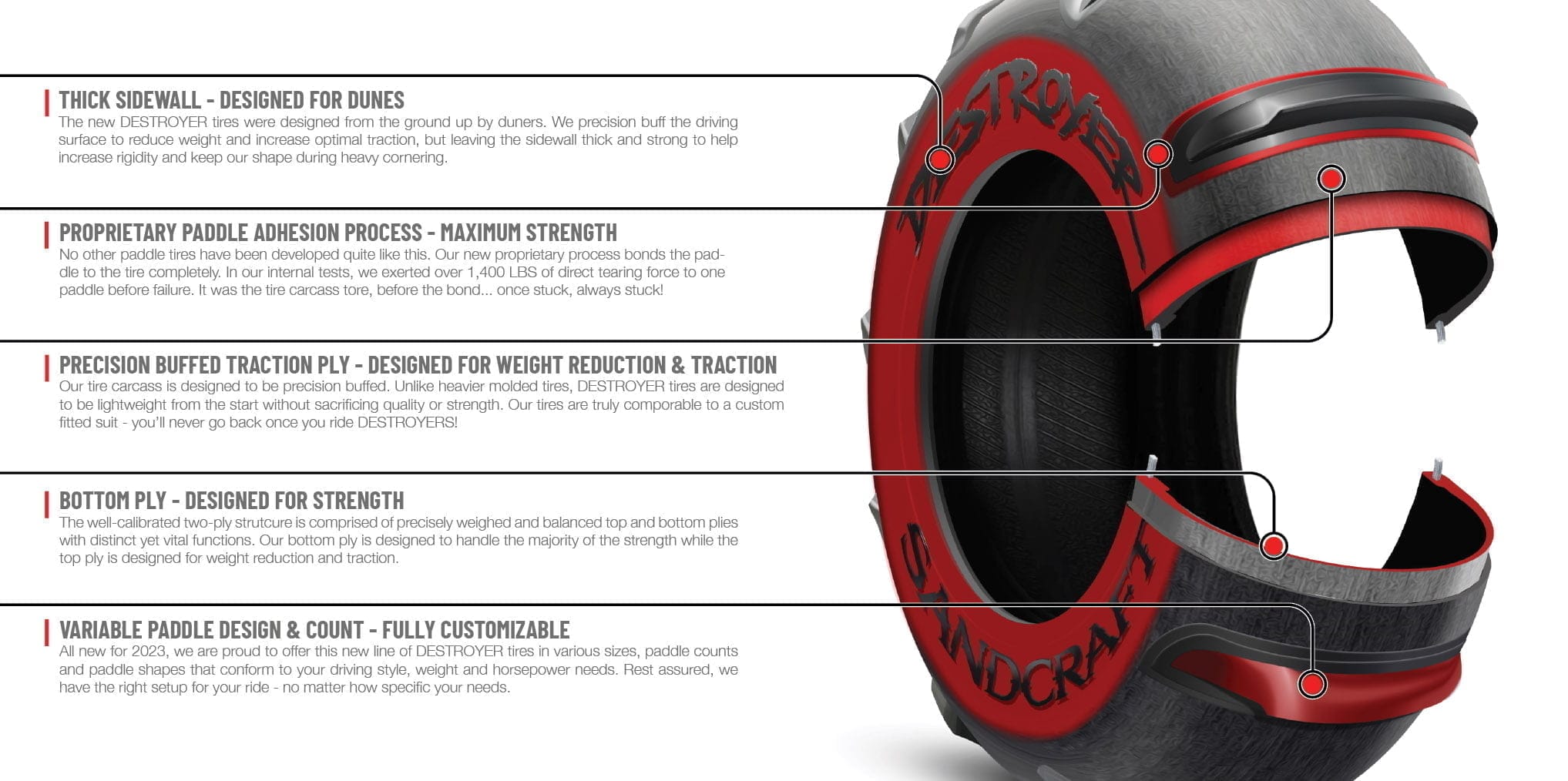 SANDCRAFT DESTROYER tires have undergone a complete redesign for 2023. We started with the Mohawk design and reworked it from the ground up. Weight is still our number one concern, but we also incorporated turning dynamics and traction.