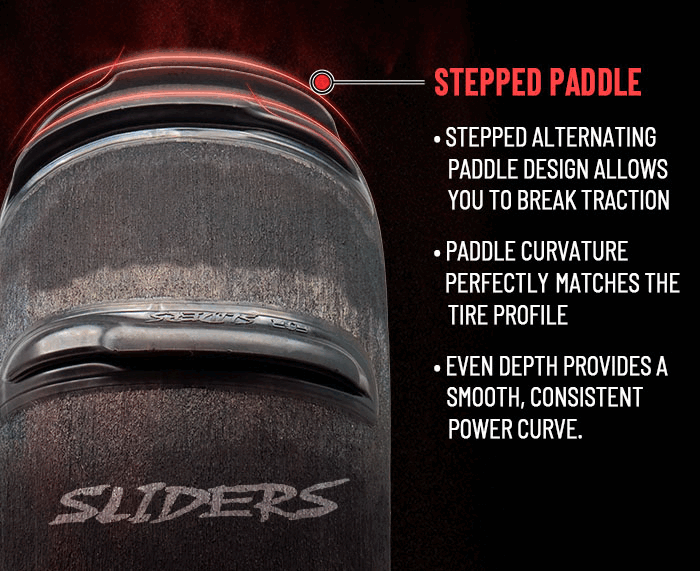 Our most exciting patented paddle in the DESTROYER lineup is the SLIDER. This innovative design features a new stepped alternating paddle design, a first of its kind in the industry. With 1” of height across two thirds of the 13” width, then dips to 1/2” on the final third. This design is then flipped on alternating paddles. We call these SLIDERS for a reason! This design breaks traction more easily and is ideal for the driver who loves allowing the rear end of the car to play more freely across the sand.